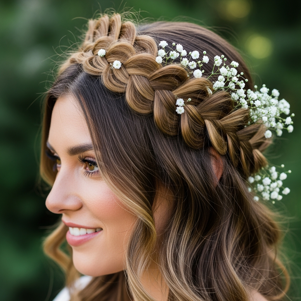 Perfect for outdoor or bohemian-themed weddings, the messy braided crown offers a whimsical and ethereal aesthetic. This style involves weaving thick braids around the head and gently pulling them apart to create volume and a relaxed feel. Incorporating small sprigs of baby’s breath or delicate greenery can further enhance the organic nature of this look. It is a practical yet stunning choice that keeps hair secure throughout a long day of celebrations.