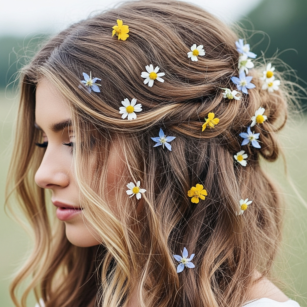 For a garden or woodland wedding, nothing beats the beauty of loose, natural waves infused with fresh blooms. This look celebrates an organic aesthetic, with waves that appear wind-swept rather than perfectly styled. Small flowers can be tucked throughout the hair or concentrated in one area to create a floral crown effect. It is a breathable, comfortable style that looks effortlessly beautiful in an outdoor setting.
